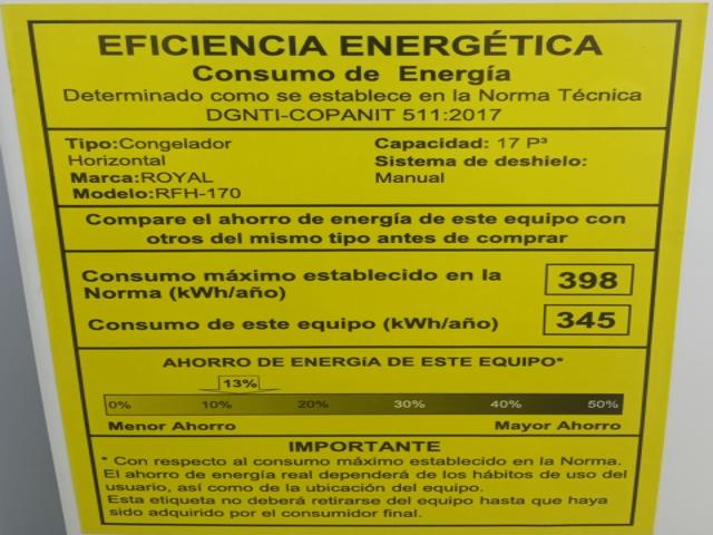 Congelador horizontal con luz led en el interior, capacidad de 480 litros, clima clase tropical, refrigerante R290A (90gramos, voltage 115v, llave en la puerta, luz de funcionamientos y luz de encendido, consumo de 345 kWh/ año, agente espumante cyclopentane, frecuencia 60Hz, potencia nominal 252watts, peso neto 59.5 kilogramos.