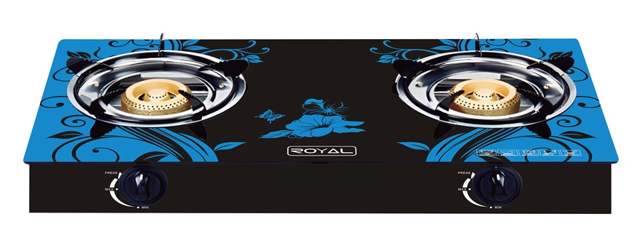 Estufa 2 quemadores de encendido automático, estructura en metal y vidrio templado resistente al calor, botones de plástico, gas LPG.