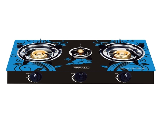 Estufa 3 quemadores de encendido automático, estructura en metal y vidrio templado resistente al calor, botones de plástico, gas LPG.