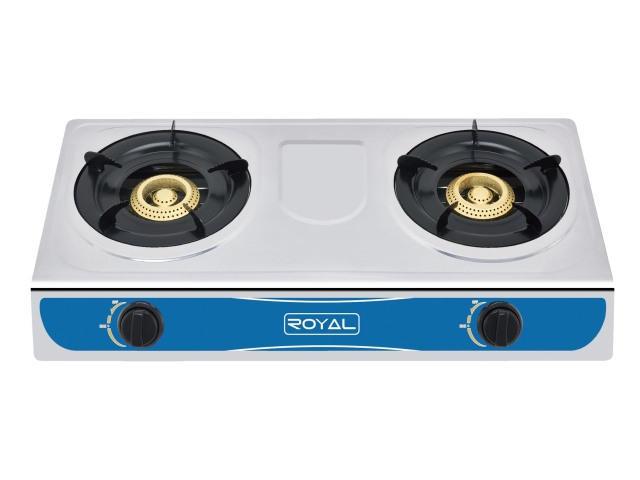 Estufa 2 quemadores de encendido automático, estructura en acero inoxidable, botones de plástico, gas LPG.