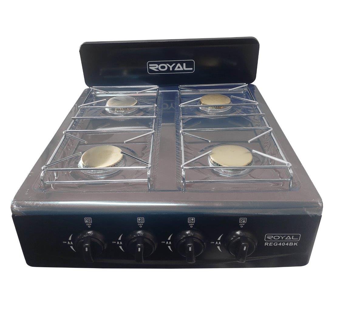 Estufa a gas de 4 quemadores, quemadores de bronce y aluminio, parrillas metálicas, perillas de plástico.