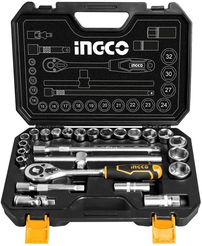 Kit de socket de 25 piezas (1 pza de extensión de barra de 125mm, 1 pza de extensión en T de 250mm, 1 pza ratchet de ½”, 18 pza de dados del 10mm al 32mm.
