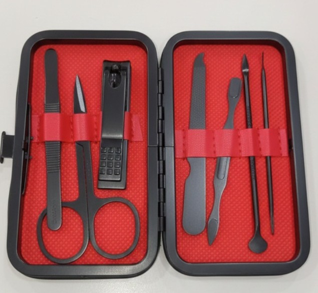 Juego de corta uñas de 7 pza, 1 corta una pequeño, 1 tijera, 1 lima, 1 punzón, 1 piza para cejas, 1 empujador de cuticula.