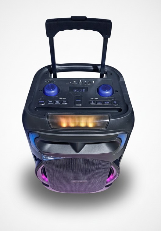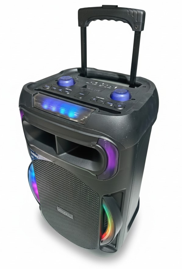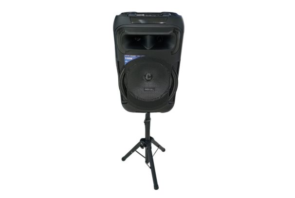 Parlante de conexión inalámbrica con batería recargable, radio FM, entrada auxiliar, usb, micro sd, micrófono, uso discoteca, altavoces de 12”, batería de 7.4v, 3000mah, potencia de 5000w, incluye cable tipo c.