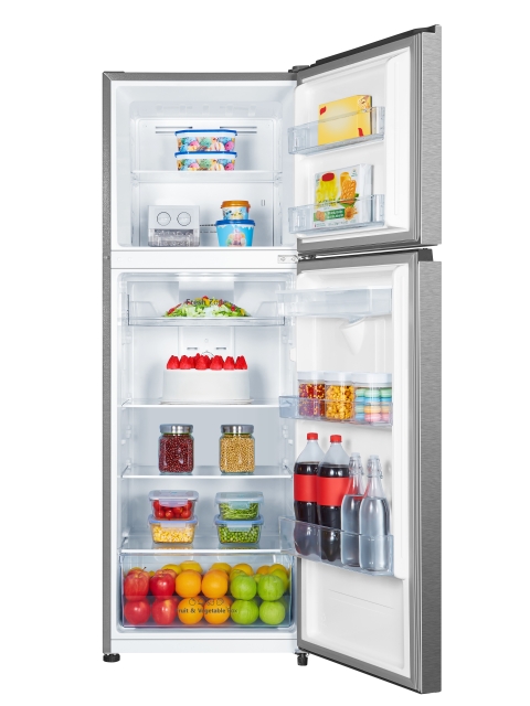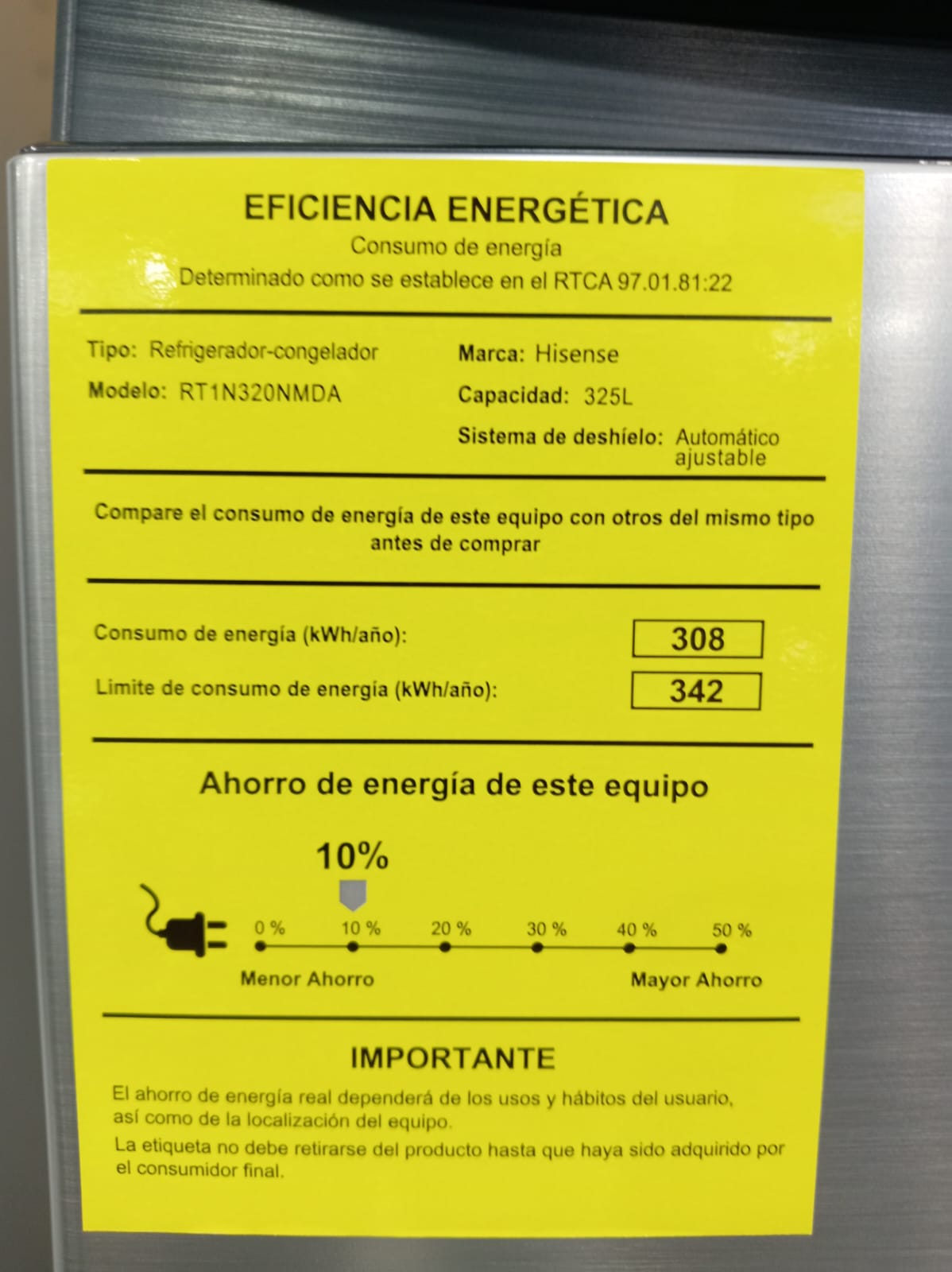 Refrigerador de 325 litros, estantes de vidrio templado, dispensador de agua, luz led, voltage 115, frecuencia 60Hz, refrigerante r600a (34 gramos, agente espumante ciclopentano, control análogo, consumo 308 kWh/ año.