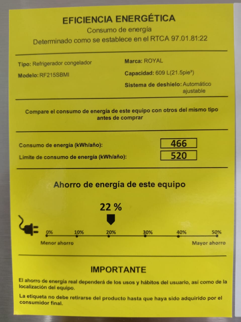 Refrigeradora 21.5p3 (609 litros, estantes de vidrio templado, puerta reversible, luz led, control táctil, voltaje 115, frecuencia 60Hz, potencia nominal de lámpara 3 amperio, potencia nominal de descongelación 200w, refrigerante R600 (50gramos, consumo 466 kWh/ año, agente espumante ciclopentano.