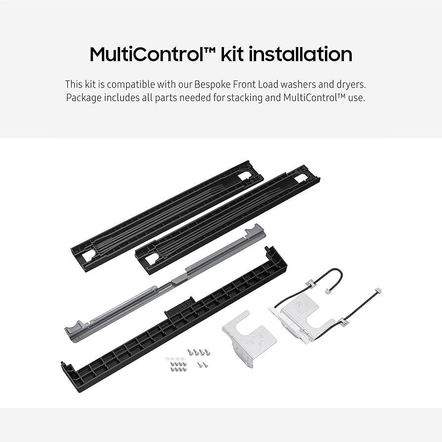 Este kit es compatible con nuestras lavadoras y secadoras de carga frontal Bespoke, el paquete incluye todas las piezas necesarias para apilar y usar multi control.