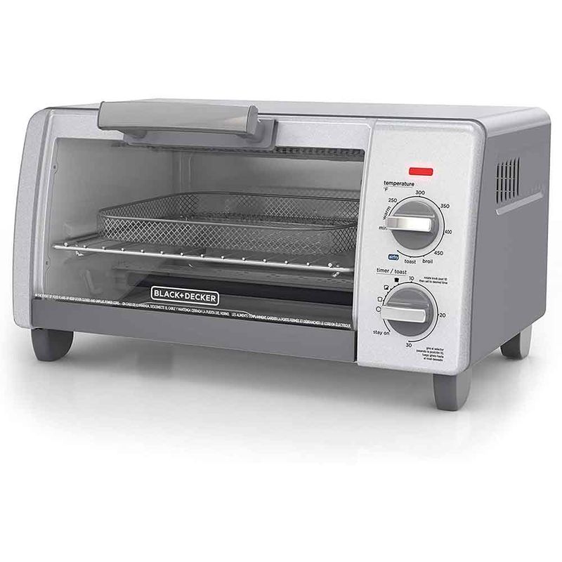 Tosta horno de 4 rebanadas con función para freír, interior de 23 cm, reloj automático de 30 minutos con función de continuo, 2 perillas de controles simplificados, incluye bandeja para hornear parrilla de asar y bandeja de malla para freír con aire, voltage 120v, frecuencia 60Hz, 1150 watts, consumo 0.600kW/h.